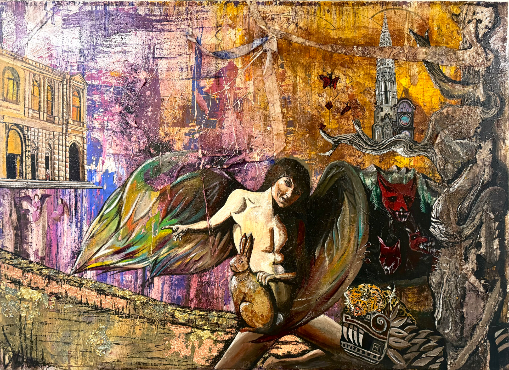 Der Richtige Weg is an enlightening piece that depicts Dante as a golden rabbit, guided by Virgil's angel back home through the divine comedy. The painting beautifully showcases mythical creatures such as Cerberus representing the underworld and evil, a forest symbolizing solitude, a church representing religion, and an astrological clock symbolizing time. The background features Quetzalcoatl and a jaguar, portraying the rabbit as the prey. The artist's use of vibrant abstract elements in warm yellows, browns, purples, blues, and whites adds depth to the piece.