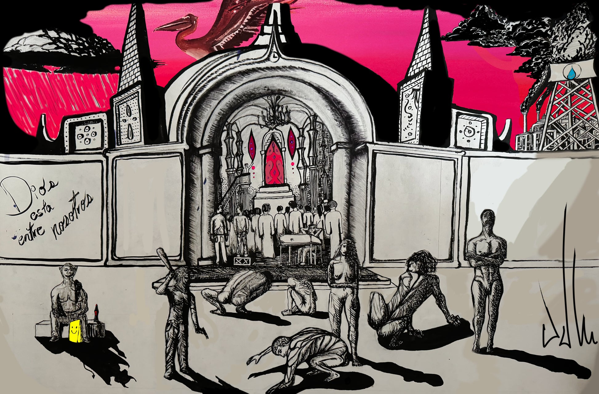 Presenting Iglesia Actual, a thought-provoking portrayal of society both inside and outside of churches. This controversial piece begs the question, is belief truly worth pursuing when demons lurk and catastrophes strike are ocurring right now? Is prayer and faith truly beneficial or are we turning a blind eye to reality? Delve into this intense exploration of religion and society.