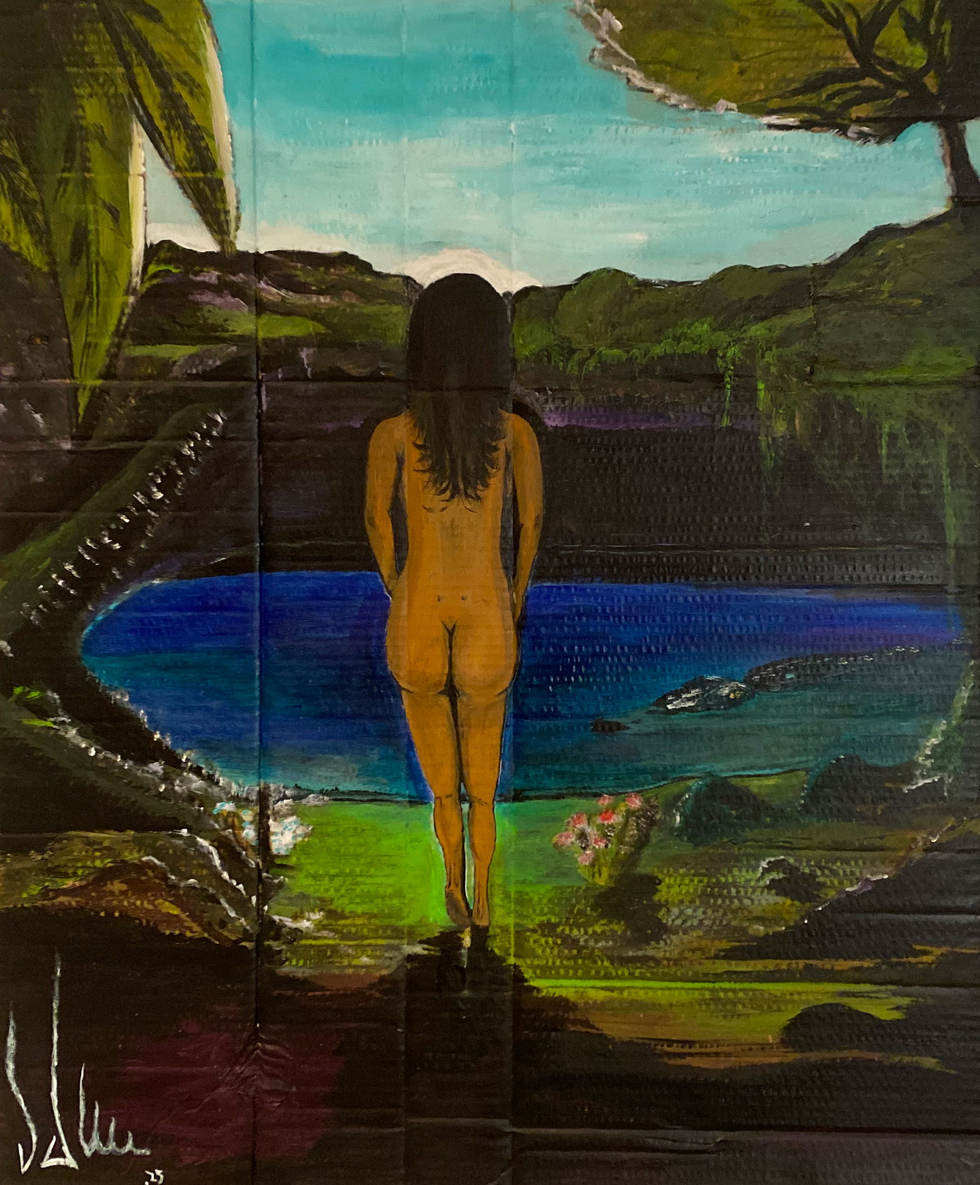 Ella cerca del borde presenta una escena de aproximación y movimiento delicado y natural, con tonos verdes y azules que evocan la naturaleza. Experimenta una sensación realista y cercana al observar esta obra de arte.
